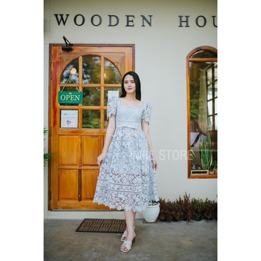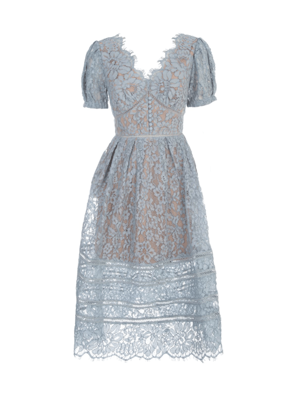 Pink guipure lace taffeta mini dress guipure lace midi dress. Light blue dress featuring guipure lace, round neck, short sleeves, empire line, exposed rear zip fastening and scallop edge.